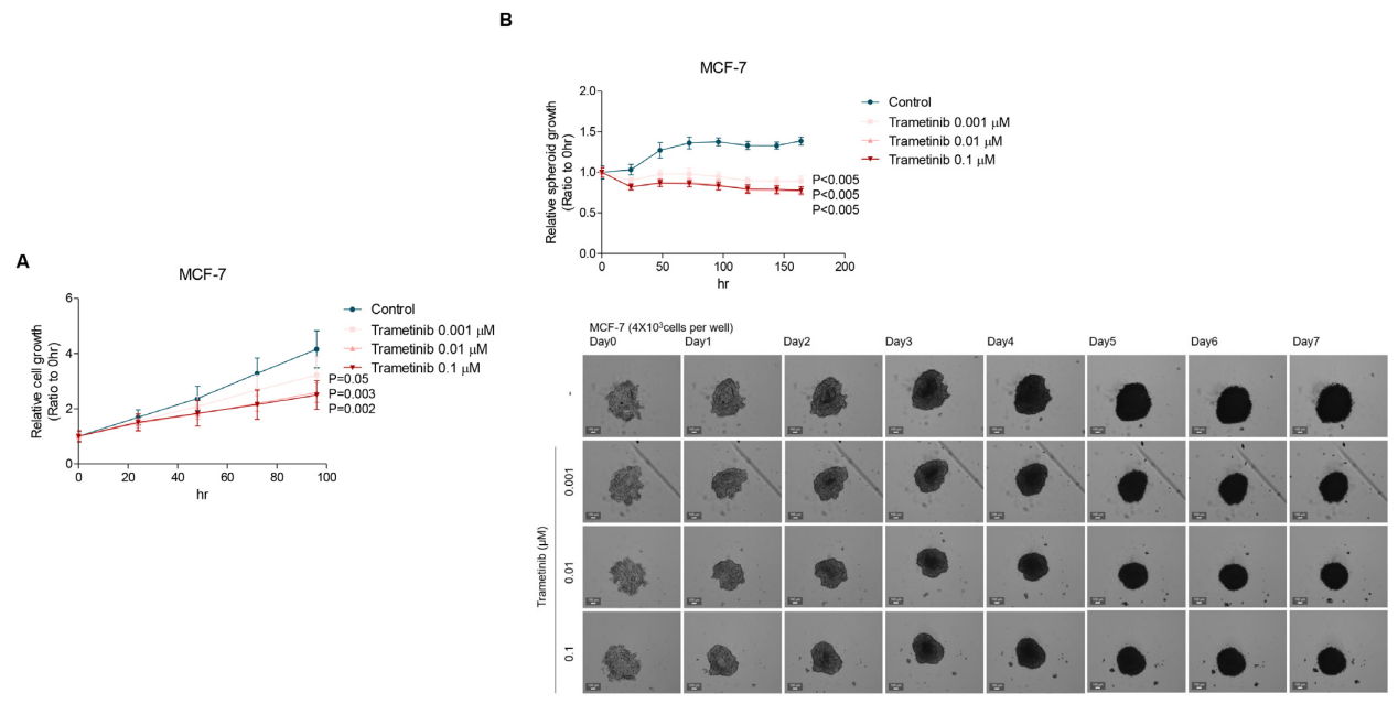 通过CellCyte X活细胞动态成像系统观测发现:在2D培养体系中,曲美替尼对MCF-7细胞增殖呈现剂量依赖性抑制,细胞覆盖面积较对照组显著降低。为模拟体内肿瘤微环境复杂性,本研究采用3D肿瘤球体模型。结果显示曲美替尼同样可显著抑制球体增长,表现出稳定的抗增殖效应。上述结果证实,曲美替尼在 2D 单层细胞及 3D 球体模型中均具有一致的抑瘤活性,不受细胞间相互作用及微环境异质性的影响。