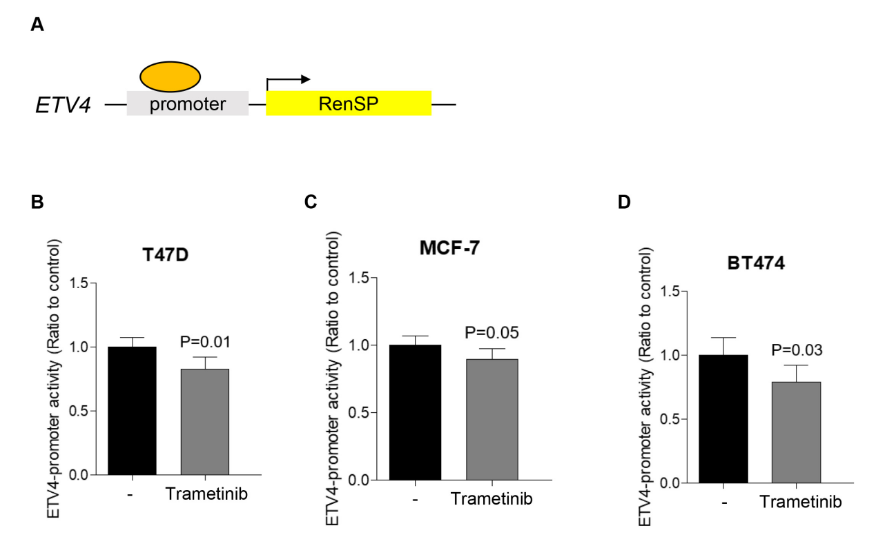 采用双荧光素酶报告基因系统检测ETV4启动子活性。MCF-7、T47D、BT474细胞以1×10⁵个/孔接种于12孔板,过夜培养后使用Fugene6试剂瞬时转染含ETV4启动子-RenSP的质粒。细胞在含/不含1 μM曲美替尼的培养基中培养24小时,使用发光仪(Tecan)检测海肾荧光素酶活性。