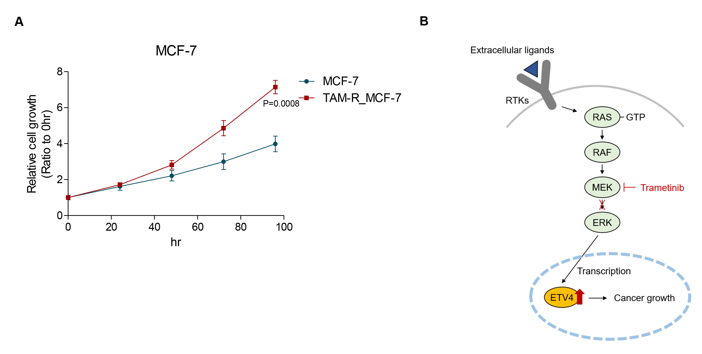 TAM-R_MCF-7 细胞增殖速率显著高于亲本细胞,表现出更强的恶性表型。结合上述结果推测:在 ER+乳腺癌进展及耐药过程中,MAPK 信号异常激活可转录上调 ETV4,进而促进肿瘤细胞快速增殖。曲美替尼可通过阻断 MAPKETV4 信号轴,成为克服他莫昔芬耐药的潜在策略。