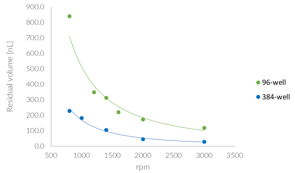 图 4. 96 孔板(绿色)与 384 孔板(蓝色)在不同转速下离心后的残留体积(均值,n=96,n为孔数)