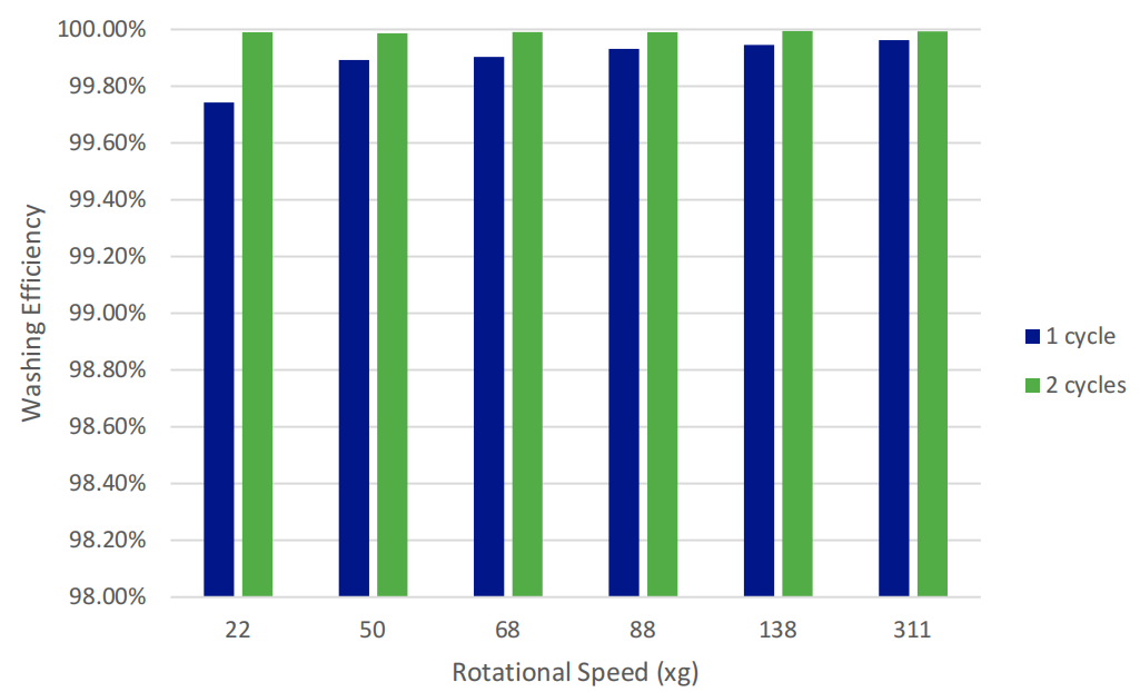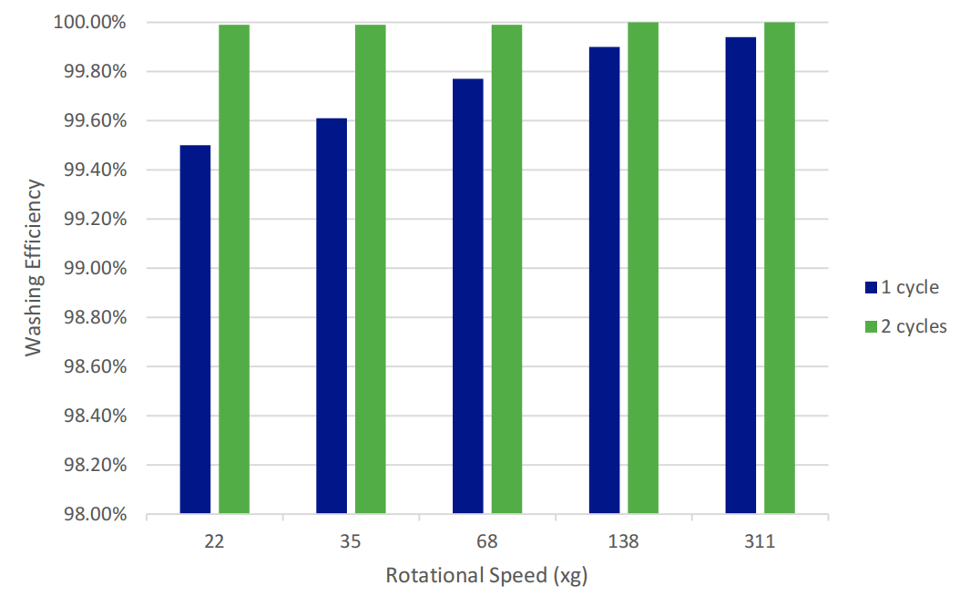 经过2个清洗循环后,无论采用何种转速,均可实现99.99%以上的荧光信号去除,达到近乎完全清洗的效果。这一结果表明,使用 C.WASH 可将传统洗板步骤缩减至2次,有效简化实验流程,缩短实验周期,提升实验效率。