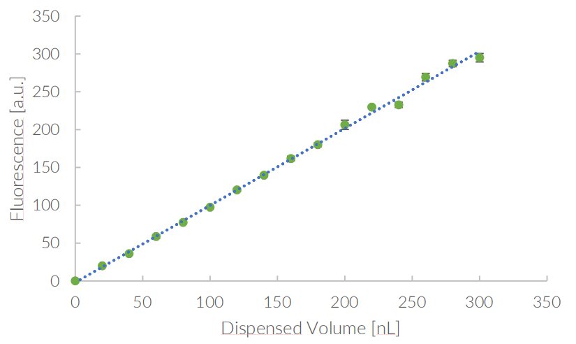 采用 I.DOT 微量分液仪制作残留体积定量标准曲线,分液体积范围为10 nL–300 nL,设置体积梯度,每组实验设置3个复孔,以保证数据的可靠性。