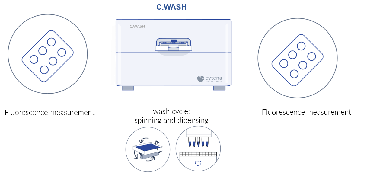 实验采用荧光素溶液填充微孔板,通过对比清洗前后的荧光信号强度,定量计算清洗效率。其中,单次完整清洗循环定义为“离心甩干板内液体 → 自动加注清洗液”,这两步操作均由 C.WASH 全自动独立完成,全程无需人工干预。